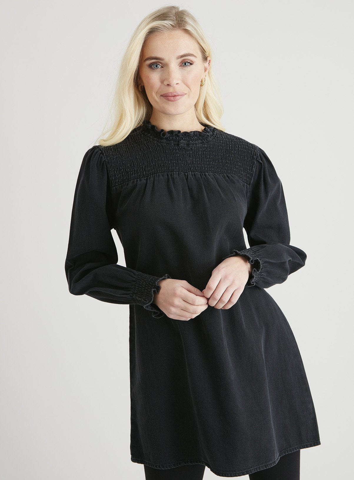 In a classic black denim, this flattering tunic has a high neck with frill and a pretty shirred yoke and cuffs. Layer over leggings and team with ankle boots for the head to toe look - the choice is yours. Online exclusive Black denim tunicHigh neckShirred yoke & cuffsLong sleeves Pure cottonModel wears a size 10Model height is 5'6"