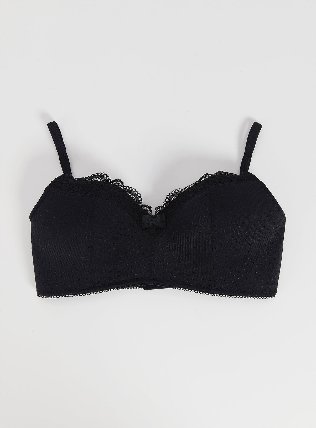 Our black Jacquard stripe and dot t-shirt bra with hook and eye fastening, balcony cups, adjustable straps, and bow and lace detail is a lingerie drawer essential. In a non-wired design for a comfortable fit, team with black Brazilian knickers for the head to toe look. Also available in white.Black T-shirt bra Balcony cups Jacquard stripe & dotsNon-wired Adjustable straps Bow & lace detail Hook & eye fastening Keep away from fire