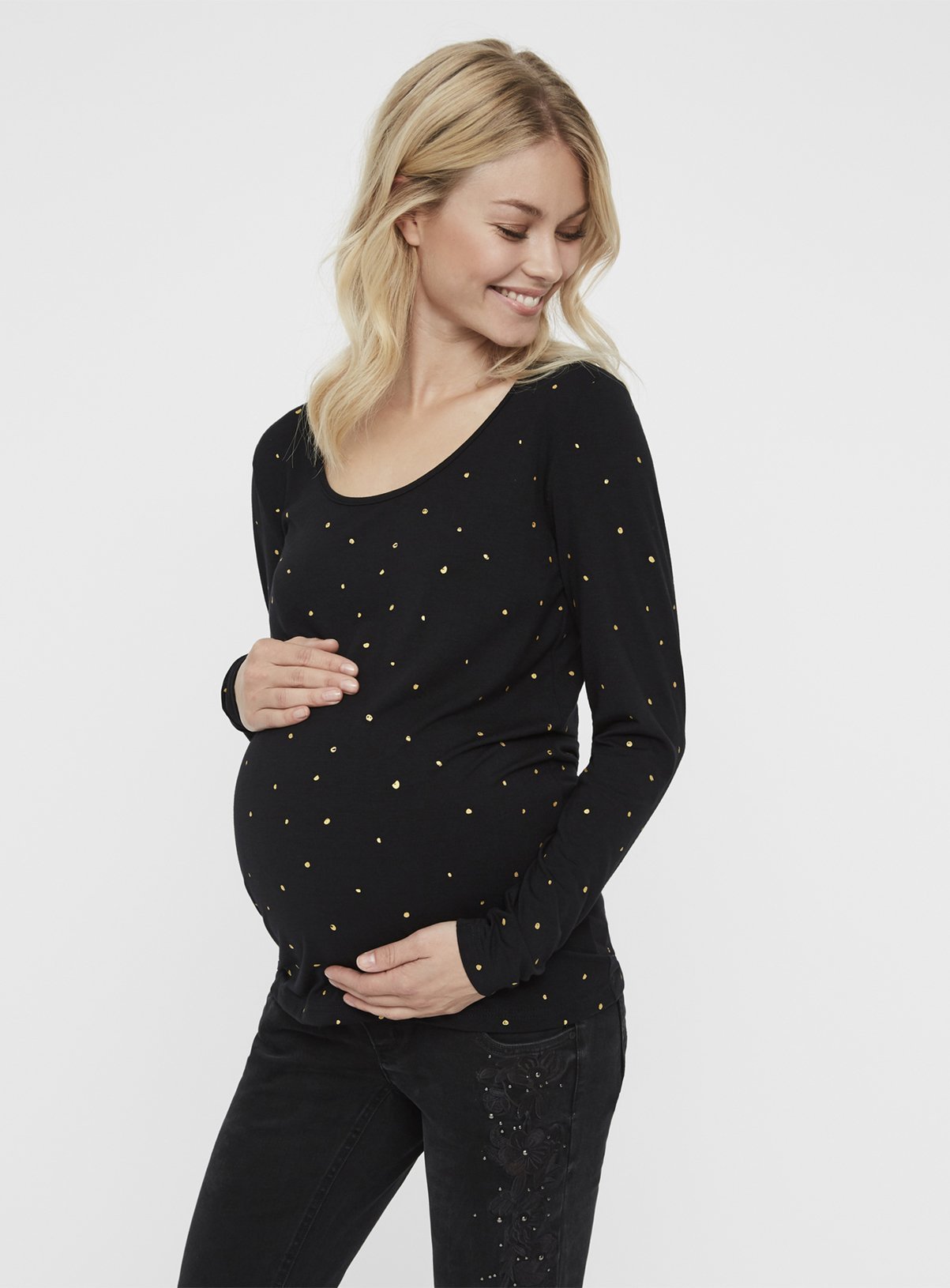 Crafted from a soft and stretchy jersey fabric, this dotted maternity top is designed to fit throughout your pregnancy for maximum wear and comfort. With a round neck and long sleeves, pair it with jeans from the full Mamalicious collection.At MAMALICIOUS, our motto is ‘Shape with style’. Supporting mothers-to-be and new mums to feel chic and stylish, whatever the occasion. XS - UK 6, S - UK 8, M - UK 10, L - UK 12, XL - UK 14, XXL - UK 16, XXXL - UK 18. MamaliciousLong sleeved Soft & stretchy jersey fabric Round neck Dotted Designed to fit throughout pregnancy