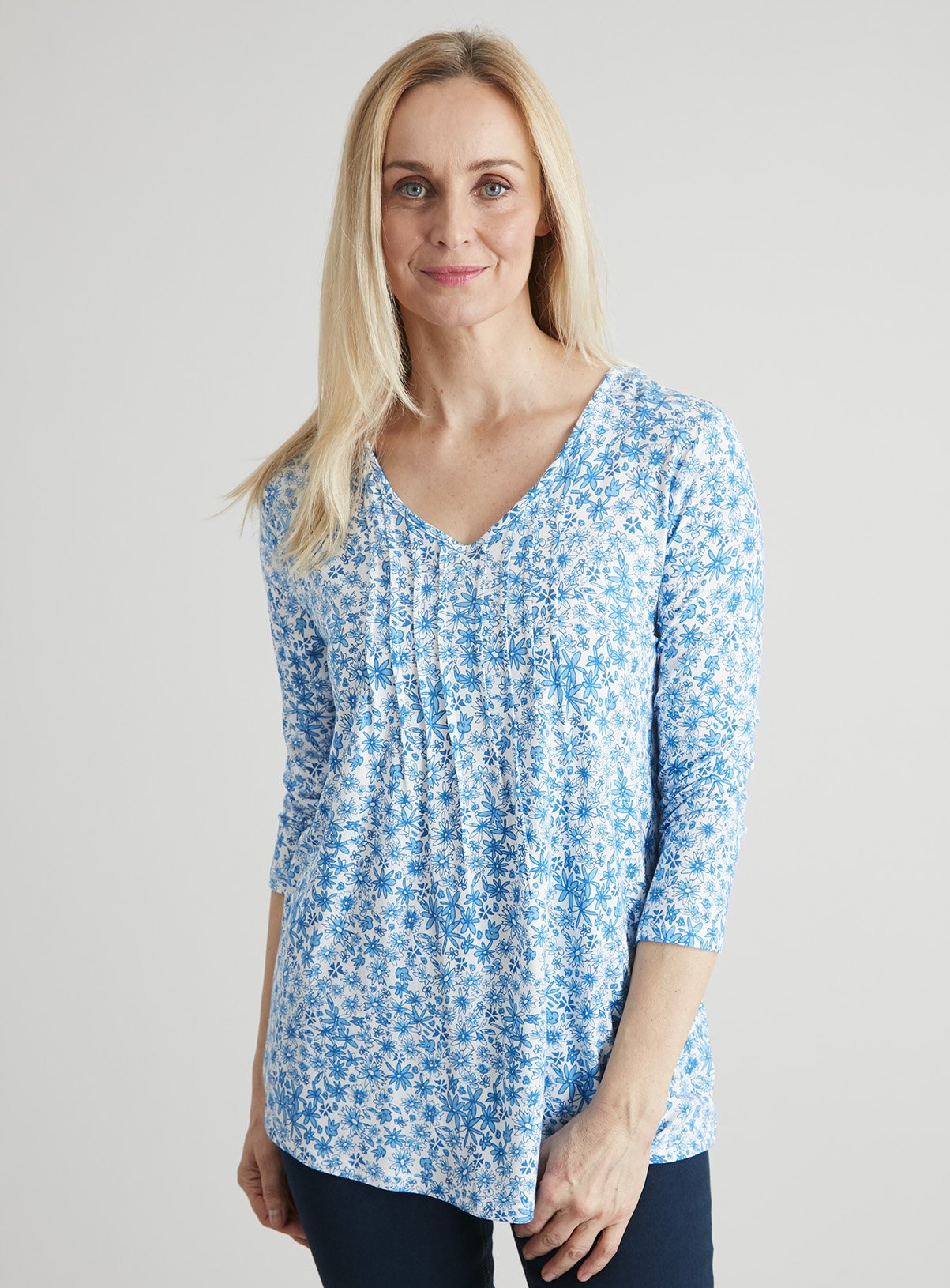 This top is printed with blue hand-drawn flower print and finished with pintucks and gentle draping. Crafted from Tencel blend fabric with botanical origins and long-lasting softness. French tuck it into some jeans for an easy, cute outfit. Blue floral topPintuck detailThree quarter sleevesDrapingModel wears a size 10Model's height is 5'8"