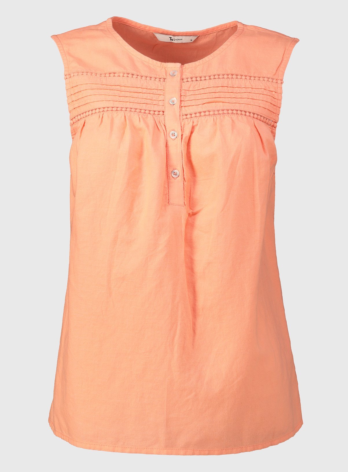 In a punchy shade of coral, this shell top is so summer-ready. Made from a linen-rich blend to keep you cool with gently dropped arm holes, it's got a pretty crochet and pintuck panel. Match with some white shorts for a relaxed look. Online exclusiveCoral linen-rich shell topCrochet detailPintuck panelButtonsDropped arm holes