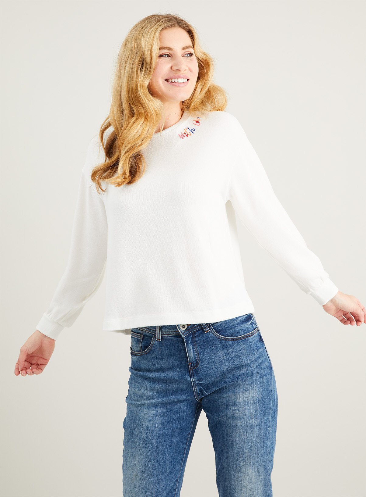 Super soft and snuggly, this cream top with colourful slogan design at the shoulder is great for lounging or for layering up a laid-back casual look at weekends. We like it paired with jeans and canvas trainers for the complete look - the choice is yours.Cream soft touch top 'With love' across shoulder Round neck Long sleeves