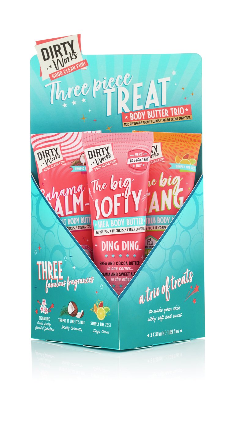 Is dry skin one of your grumbles? ! Then get ready to rumble with these buttery moisture marvels. A handy travel sized trio in three mood-boosting, mouth-watering fragrances. The Big Softie blends skin conditioning Argan oil with Vitamin E and is packed with our fruity and floral Signature scent. The Big Tang is infused with our Simply the Zest citrus scent and is the ultimate boost for the day ahead. Bahama Balm-a includes our Tropic Like It's Hot holiday-inspired fragrance and Coconut Oil, Shea and Cocoa butters. The perfect size for your travels, these mouth-watering, mood boosting scents are a total skin saviour. Suitable for vegans. Cruelty free. EAN: 5060528321006.