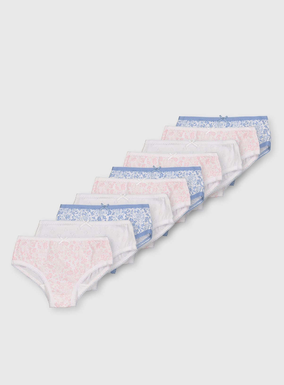 Our ten pack of assorted briefs come with pretty ditsy floral and pointelle designs to pick from. All are crafted from pure cotton for a super soft feel, and come with elasticated waistbands for added comfort. Mix and match with crop tops from our wide selection of essentials. 10 Pack assorted briefs Blue & pink ditsy floral & white pointelle designsElasticated waistbands Pure cottonKeep away from fire