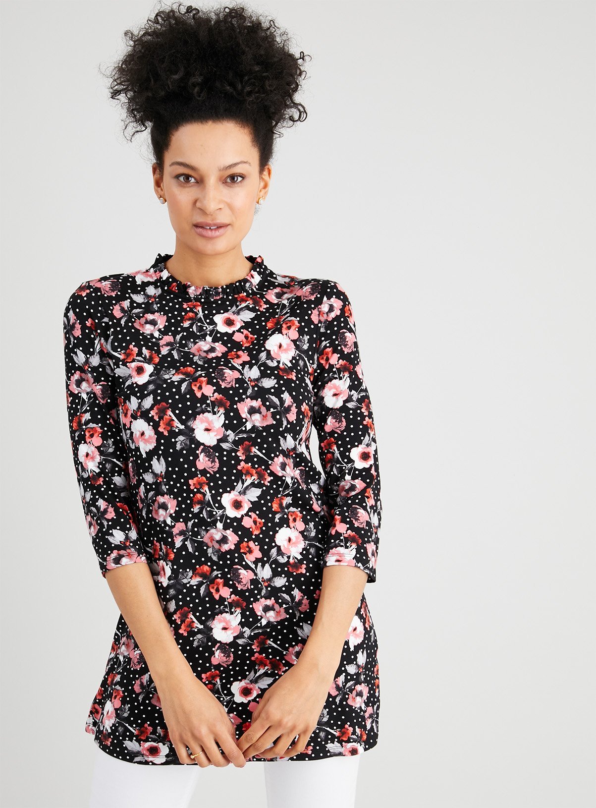 Flower power is here to stay - tap into the trend in this tunic with a pretty all-over dotty floral print. With a high frilled neck, three quarter sleeves and gentle draping, you'll reach for this piece again and again. Team with leggings and boots. Floral print tunicHigh frilled neck3/4 Length sleeves Longer length
