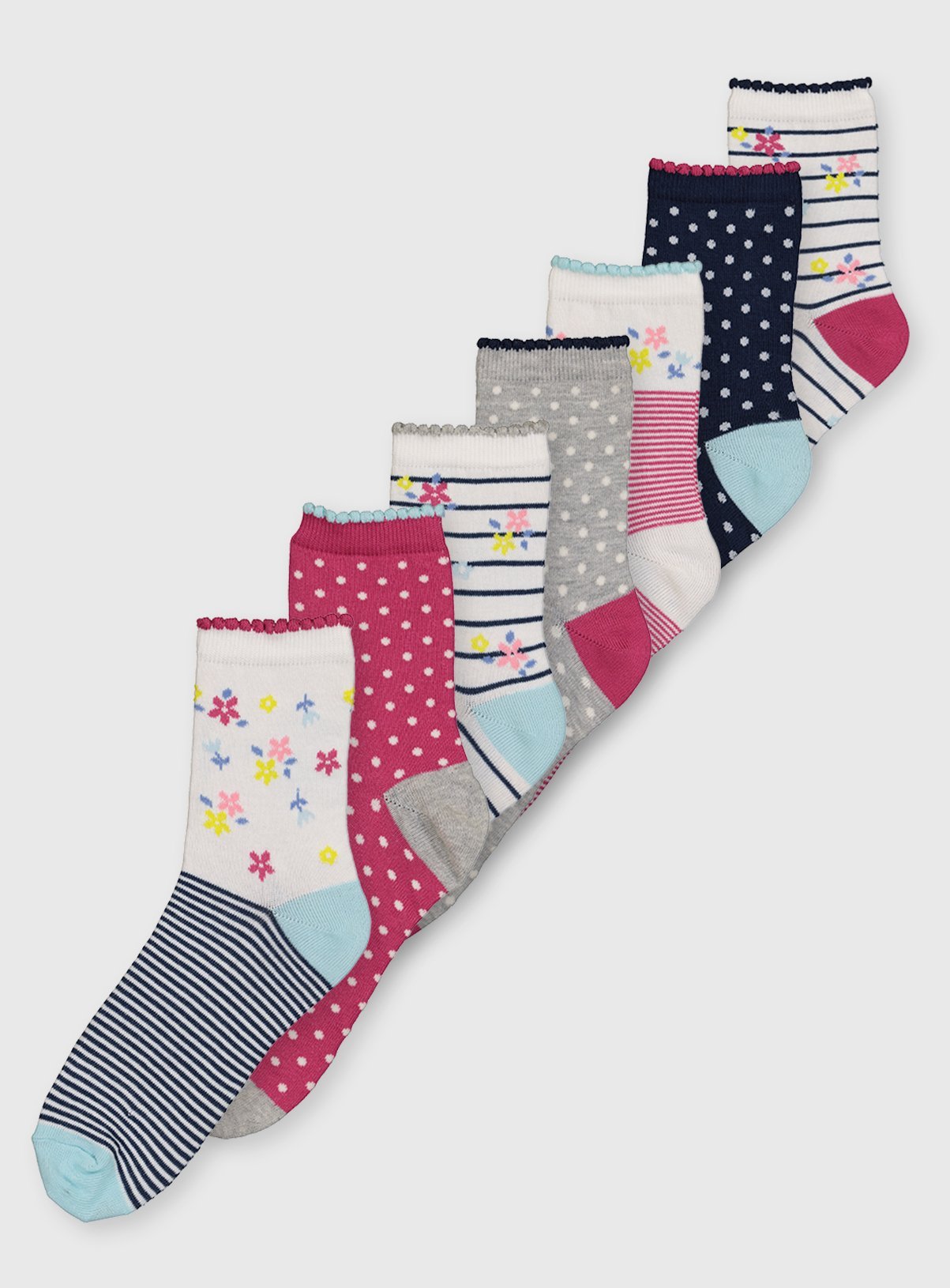 This pack of seven cotton-rich, colourful ankle socks includes floral, spotted & striped patterns to choose from. With one for each day of the week, they'll never tire of this multipack.7 Pack ankle socks Spotted, floral & stripe patterns Infant sizes: 3-5.5, 6-8.5 & 9-12Adult/Jr sizes: 12.5-3.5 & 4.5-5.5/6.5Cotton-rich Keep away from fire