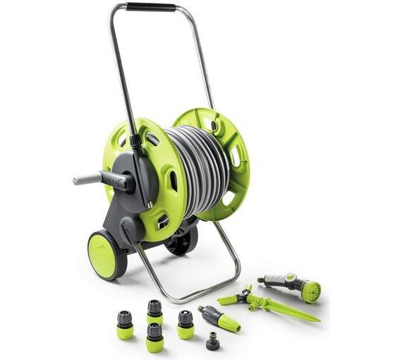 This Compact Hose Reel is versatile and suitable for any type of garden. Requiring minimal assembly, it's also easy to install and has wheels for easy movement. It is also includes a 50m x ½ hose, tap connector, 3 soft touch water flow connectors, soft touch water stop connector, adjustable spray nozzle, multi-jet spray gun and 2 arms sprinkler. This hose is compatible with all main brands of hose. 50m length, 15mm diameter hose. Accessories included:1 pattern spray gun. 1 hose end connector. 1 waterstop connector. 1 universal connector. Threaded tap connector. Adjustable spray nozzle. Outdoor tap connector. Hose nozzle. Spike sprinkler. General information:Reel can be free standing, wheeled. Size H54.5, W39.5, D38cm. Weight 8.3kg. Manufacturer's 2 year guarantee . EAN: 8004779022029.