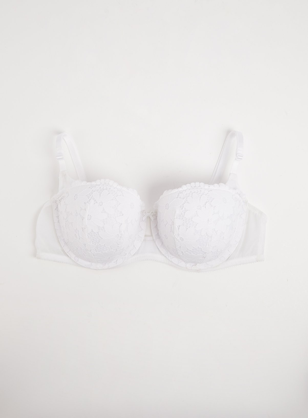 With wider set shoulder straps, balcony bras give your boobs a subtle, rounded lift and look fab with square-neck tops. Our soft white lace style comes with padded cups, underwiring for added support, and has classic hook and eye fastening at the back for an adjustable fit. Team with lace knickers from the full range for a coordinating set. Balcony style White lace Padded Underwired Adjustable straps Hook & eye fastening Cut-out apex Keep away from fire
