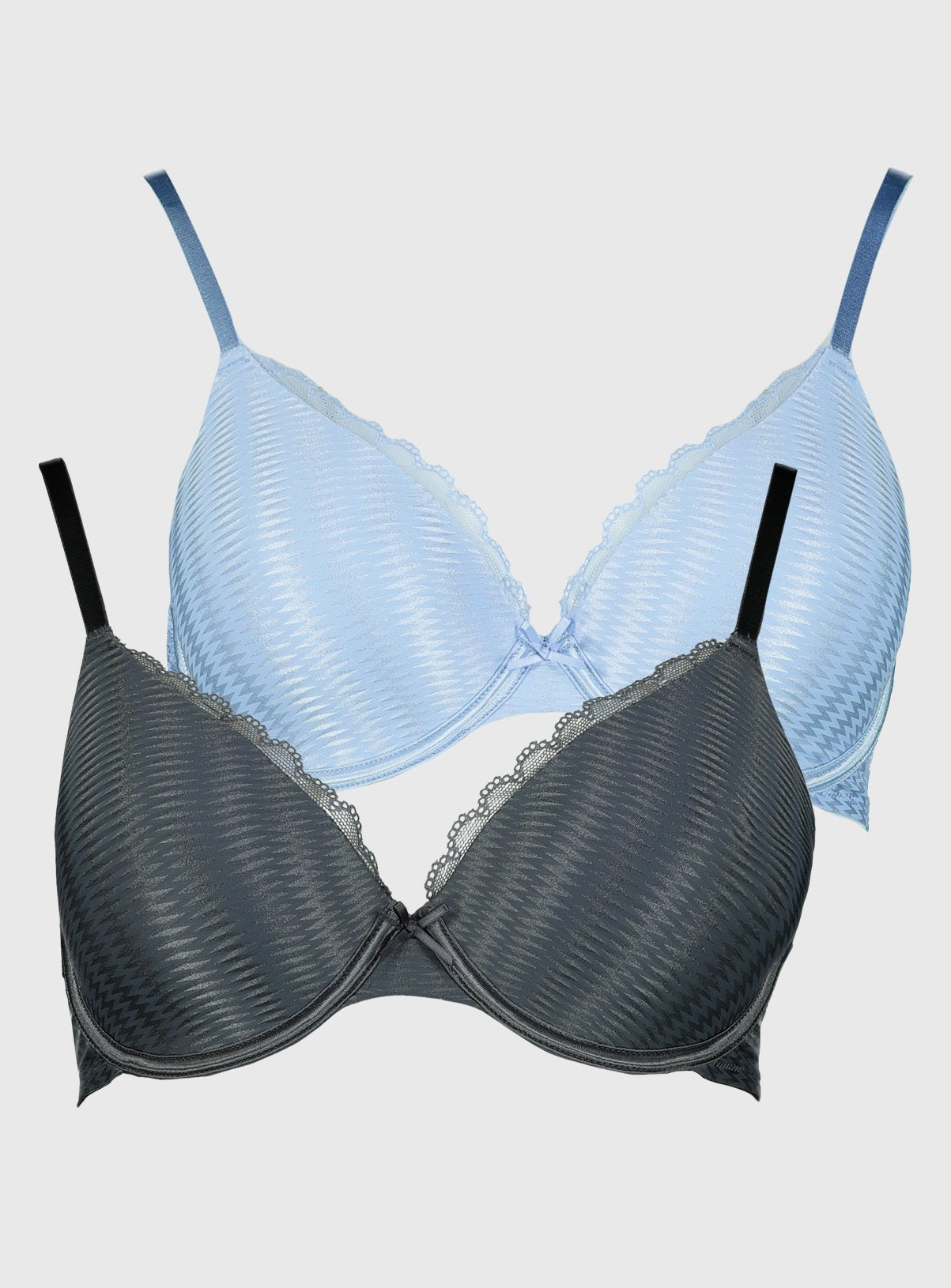 These two full cup t-shirt bras are offered in a stunning blue and dark grey colour, and are made from a satin Jacquard with a striking zig-zag pattern. The moulded and lightly padded underwired cups have delicate lace trims, and the narrow straps are adjustable to give a good fit. With a plunging apex that is finished with a small sateen bow for a touch of feminine appeal, go on, treat yourself!2 Pack lace trim t-shirt bras1 x Heron blue1 x Storm greyUnderwiredMoulded with light paddingAdjustable strapsLow apex with bowDouble hook & eye fasteningsModel wears a 34CModel's height is 5'8"Keep away from fire