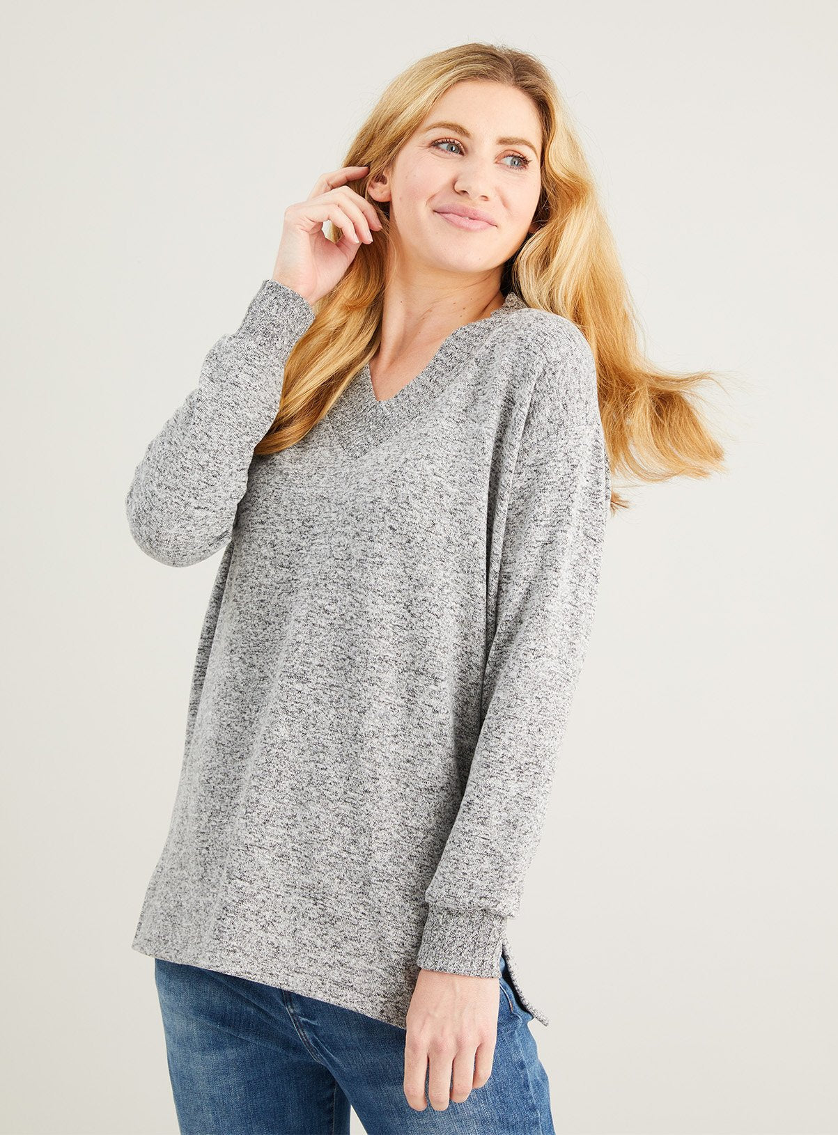 For those days when there is a slight chill in the air and you want to pop on something warm and cosy, our snuggly grey marl knitlook top will fit the bill. Designed with a flattering deep V-neck and long sleeves, team with denim jeans for a stylish look that will take you through to spring. Grey marl topKnitlook Deep v-neck Long sleevesLonger length