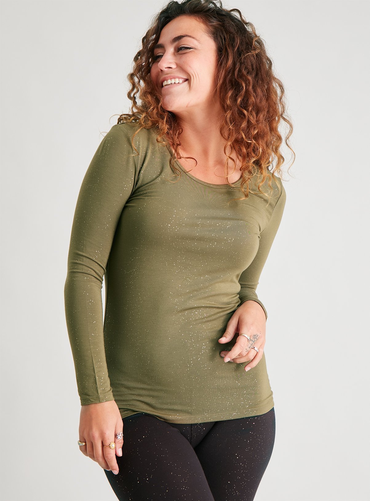 Keep off the cold during the winter months with this Heat Active top. In a pretty khaki shade, it's designed with thermal technology to retain body heat. Super soft and lightweight it's adorned with a pretty understated glitter detail. Perfect for wearing under your outfits to give you an extra cosy layer. Medium warmth rating. Available in other colours. Heat ActiveKhaki glitter thermal topLong sleeve Crew necklineLightweightRetains heatMedium warmth rating